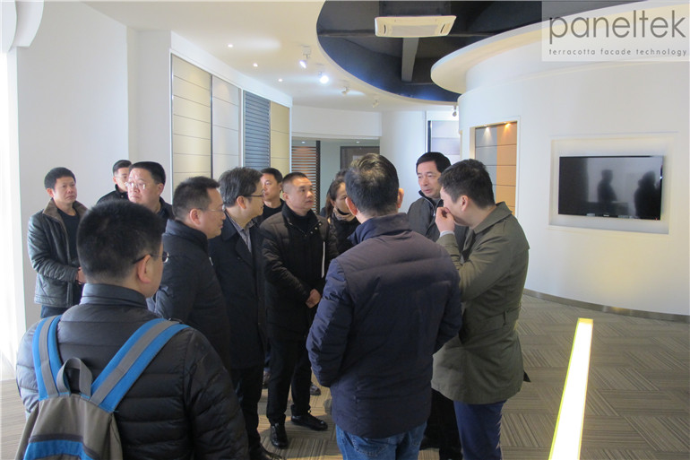 夏總向其介紹公司發(fā)展歷程與公司陶板產(chǎn)品特色。